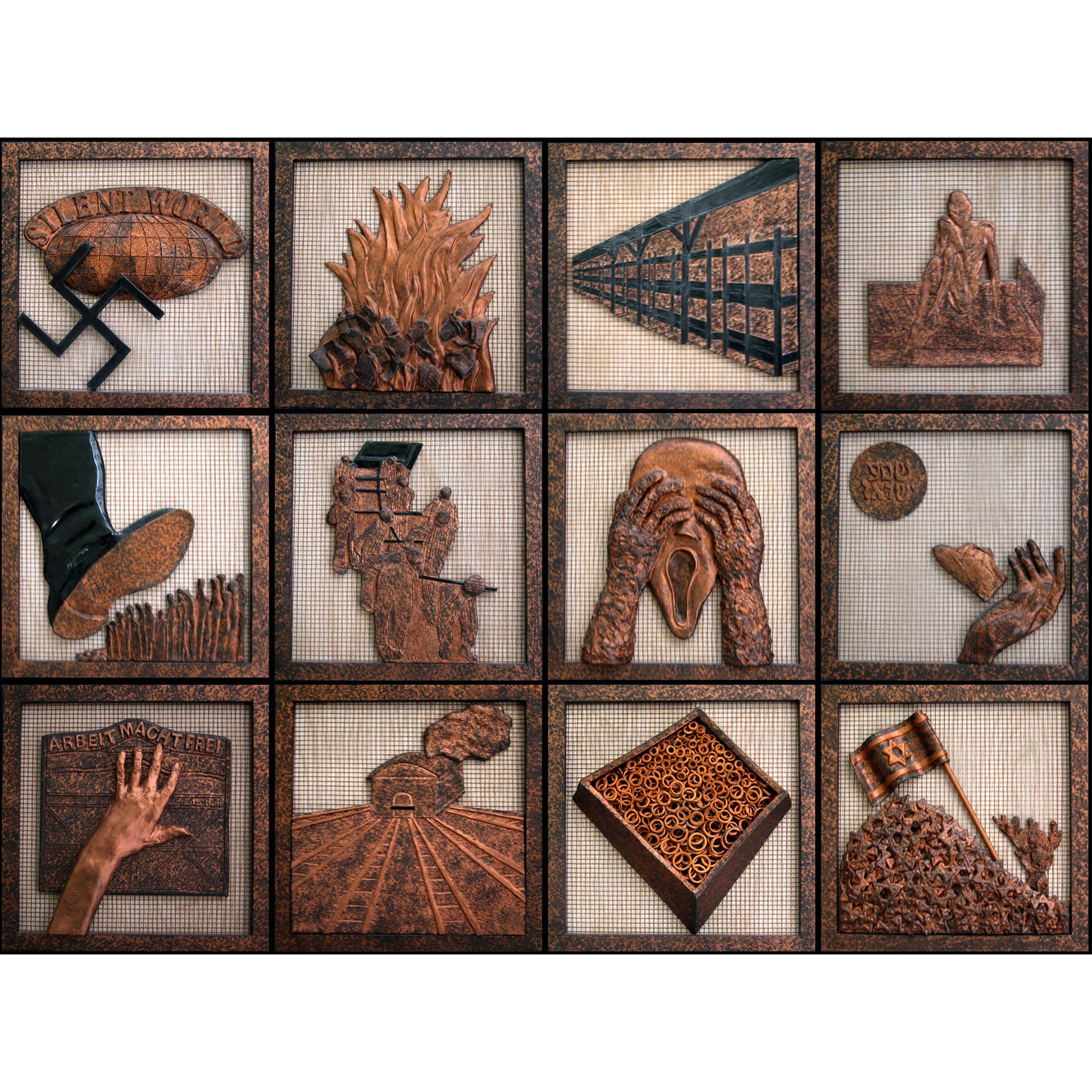 Her third group of work is larger and more complex, She depicts actual scenes from her memories of cruel soldiers, starving prisoners and stark reflections of the horror that history and circumstances forced her to witness. There is no anger, bitterness or revenge motivating this powerful work. Its strengths is in its compelling honesty against a strong implication of hope that unjust persecution and cruelty will end for all of us for all time.